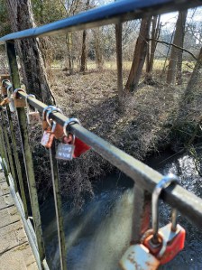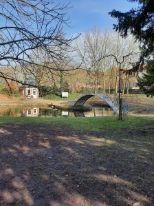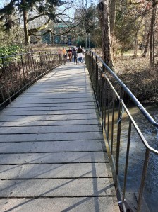 We horen het kabelen van het water. Een eerste brugje met bank.