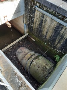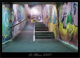 Aan de dikke paal en het stenen bankje zie je een trapje naar beneden.