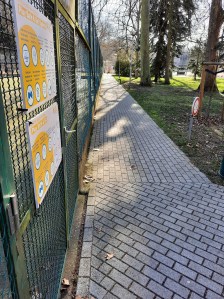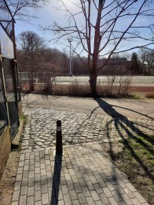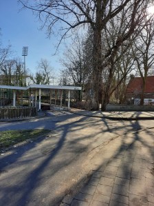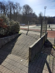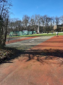 Tegenover dit gebouw kan je een tennismuur zien en een klein atletiekveld.