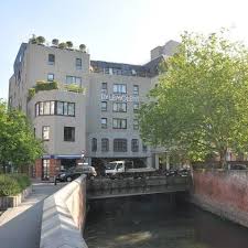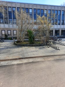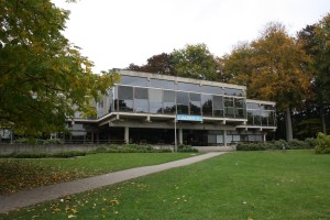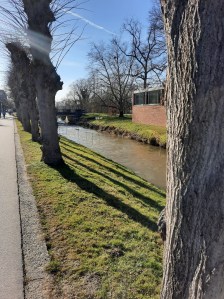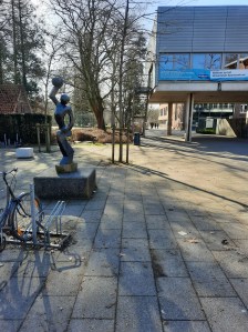 We wandelen langs het gymnasium (turnzaal) met het zwembad. Langs de overkant zien we een cafeetje: de Spuye.